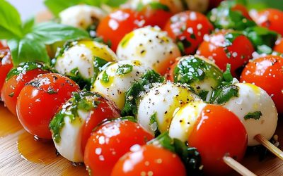 Tomat-, mozzarella- og basilikum-capresespyd 📝 Ingredienser (til 10 spyd) 20 modne cherrytomater 20 mozzarellakuler (av typen bocconcini) 20 små friske…