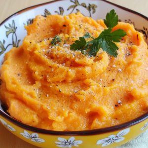 For en mildere smak, tilsett en liten klassisk potet sammen med søtpotetene: potetmosen blir enda mer balansert.