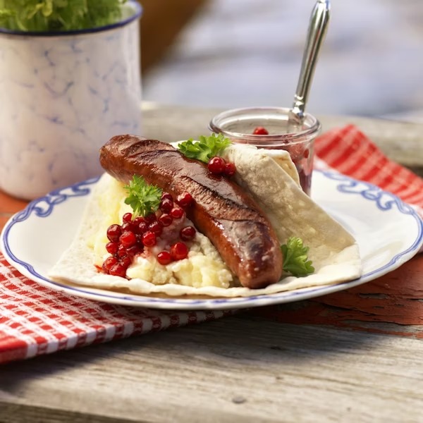Denne kombinasjonen av saftig pølse, kremete poteter og mykt flatbrød er en elsket del av svensk matkultur. Den har sine røtter i Nord-Sverige, hvor retter med enkle, lokale ingredienser lenge har vært en selvfølge. Det er ekte mat som forteller historien om livet i nord – om skoger, fjell og en livsstil bygget på håndverk, omsorg og naturens rytme.